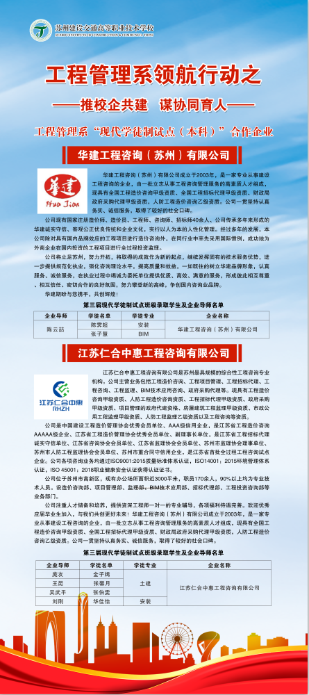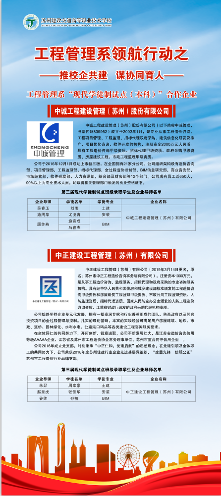 工程管理系学徒制试点工作经过三年的实践,企业参与数量明显增加,教学师资队伍逐渐完善,人才培养方案不断完善,人才输出质量有明显提升,是对工程管理系开展领航建设的有力推动。今后,工程管理系将继续“推校企共建,谋协同育人”探索校企双方 “双主体”的人才培养模式,充分拓宽学生实习和就业渠道,为学校领航建设添砖加瓦。(图/沈瑜兰 田兴 文/高秀梅)