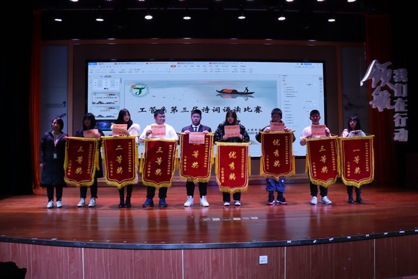 在高年级激烈的比赛中,首先是由工管一班给我们带来的《水调歌头》,优美婉转,扣人心弦。接着是由造价17401朗诵毛泽东的《沁园春•雪》,让我们台下的同学感受到了江山的气势磅礴。接下来是由造价17403带来《春江花月夜》,之后是由造价17402带来《像梦一样翱翔》,台下的老师和同学在或激昂或柔情的声音中感觉身临其境。
