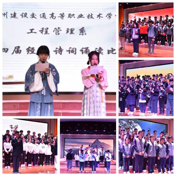 为了弘扬传统文化,提高学生们的文学素养,增强文化自信,激发学生们读书的热情,工程管理系于11月23日迎来了第四届经典诗词朗诵比赛。本次比赛由系部一二三年级班级参加,四五年级学生作为观众观看表演。系主任冯均州老师,副主任王燕老师,团总支书记张立高老师,以及各年级班主任出席此次活动。