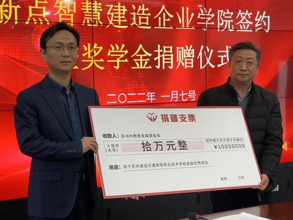 会议最后议程是由苏州市教育发展基金会副会长殷勇先生接受企业捐赠,并代表苏州市教育基金会对国泰新点软件股份有限公司助力苏州教育事业发展表示赞赏和感谢。国泰新点软件股份有限公司作为苏州地区本土成长起来的上市企业,近年来在建筑领域数字化探索取得了丰硕的成果,具有重要的市场影响力。企业积极履行企业社会责任,热心助力教育事业,自愿、无偿提供捐资助学人民币10万元,捐赠资金将纳入苏州市教育发展基金会管理。