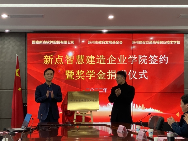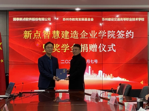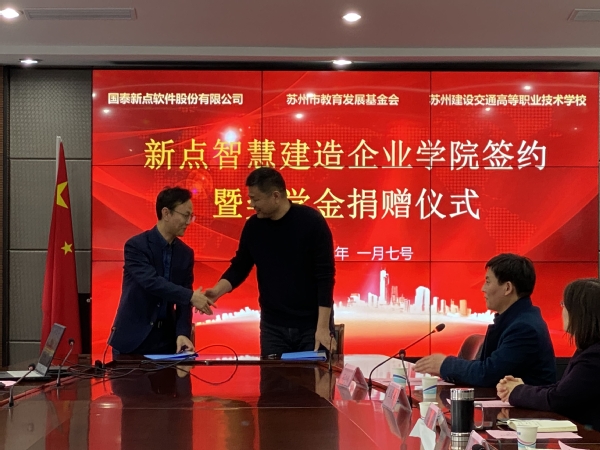 为适应区域经济社会发展的需要,深化产教融合,充分发挥校企合作优势,助力建筑行业转型升级发展。 2022年1月7日下午2:30,新年伊始,国泰新点软件股份有限公司和苏州建设交通高等职业技术学校合作共建“新点智慧建造企业学院”签约暨新点奖学金捐赠在学校行政楼311隆重举行。出席本次会议的有国泰新点软件股份有限公司业务群总经理袁明侃先生一行3人,苏州市教育发展基金会副会长殷勇先生,我校郝云亮校长、戎成副校长以及相关职能部门负责人和工程管理系部分师生。