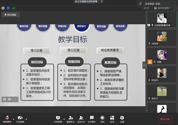 教师的教育教学质量之学校发展之根本,为适应学校高质量发展需要,狠抓教师教育教学规范和教学质量是工程管理系本学期重点推进的工作。自3月25日以来,工程管理系工程造价教研室和建设工程管理教研室每周五下午组织相关教师开展线上说课教研活动,到4月8日下午已有六位教师完成说课展示,通过说课展示,全体教师评课的环节,有效推动了教师在教学规范、教学组织、教学评价等方面的提升。尤其对于近期疫情防控期间开展线上教学的情况,老师充分思考采用多种教学手段突出线上教学和线下作业与互动的融合,有效提升教学质量。