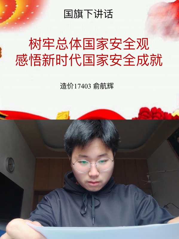 早上8:00,全系师生齐聚云端,以班级为单位准时举行线上的升旗仪式。伴随着屏幕中雄壮的国歌,全体师生通过电脑或手机屏幕,进行了一次特殊的注目礼,同唱国歌,完成了线上升旗仪式。随后举行国旗下讲话,由造价17403班的俞航辉同学带来“树牢总体国家安全观,感悟新时代国家安全成就”主题演讲,各班学生代表朗读演讲稿。系部借此国家安全教育日之机,呼吁同学要增强全民国家安全意识,提高国家安全法治意识,营造维护国家安全的浓厚法治氛围,增强防范和抵御安全风险能力,特别是在这个“疫情时代”,更要注意网络安全,在网络上学会辨别信息的真假,文明上网!