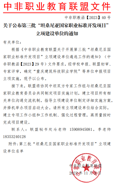 根据《中非职业教育联盟关于开展第三批“坦桑尼亚国家职业标准开发项目”立项建设单位遴选工作的通知》(中非职教函【2023】29 号)文件要求,经学校申报、联盟初审、专家评审,我校顺利获批布第三批“坦桑尼亚国家职业标准开发项目”立项建设单位。