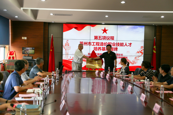 第五项议程:由苏州市造价处吴爱民处长为苏州市工程造价五方共建职业技能人才培养基地授牌,万烨锋校长代表学校接受授牌。吴处长对学校基地建设提出希望和建议,希望学校办好教育,深度推进校、政、企合作,为苏州市工程造价行业发展贡献力量。