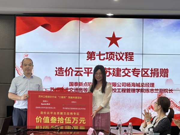 第七项议程:由国泰新点软件股份有限公司杨海城建设BG联席总经理向学校进行捐赠造价云平台苏建交专区,学校工程管理学院副院长练志兰代表学校接受捐赠。新点软件以开放共享、协作研究为导向,为学校开设“造价云平台苏建交应用专区”,以支持学校教学和科研方面的需求。