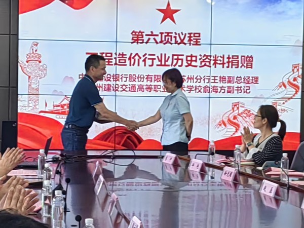 第六项议程:由中国建设银行股份有限公司苏州分行王艳副总经理代表本次共建方为工作造价职业体验中心捐赠行业历史资料,学校党委俞海方副书记代表学校接受捐赠。王总对本次共建推动行业发展提出建议,希望各方在党建共建的基础上深化合作,促进成果共建共享。