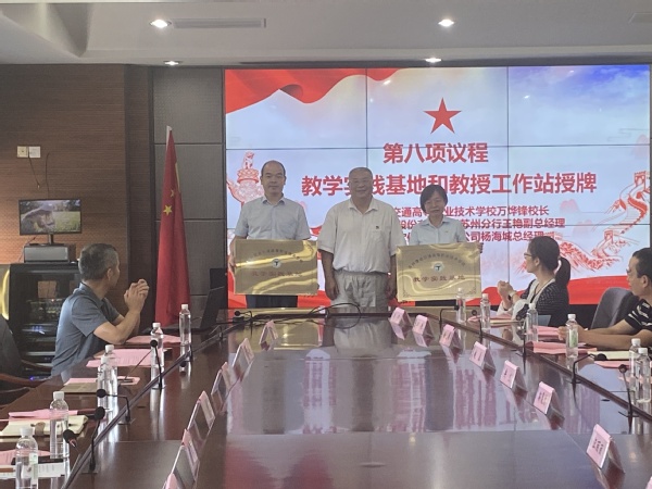 第八项议程:由学校万烨锋校长分别向中国建设银行股份有限公司苏州分行和国泰新点软件股份有限公司两家单位授牌。分别授予两家单位教学实践基地和教师工作站,并公布2024年度学校进站教师名单。