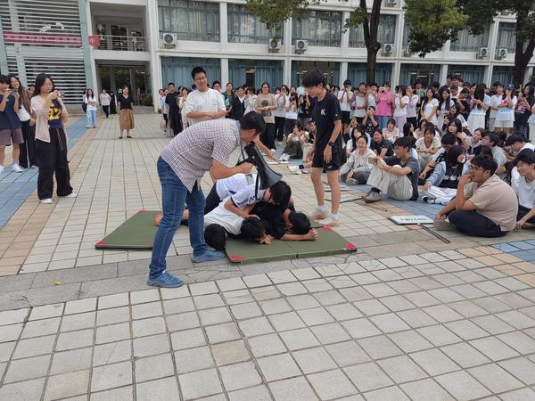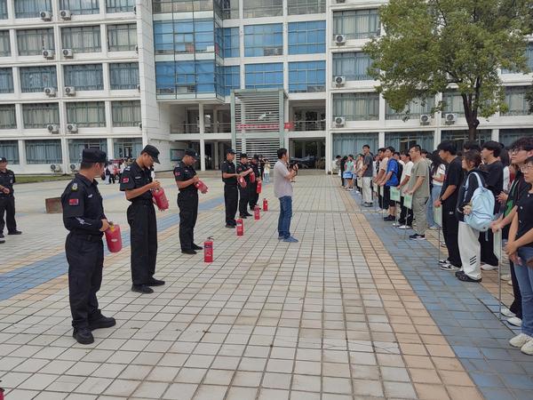 下午15:20分烟雾升腾,火警警报长鸣,总指挥下达了“教学楼发生火灾,请同学们立即撤离”的命令。我院班主任老师及楼层负责指引同学迅速响应,组织学生有序疏散,其他工作人员也在第一时间赶到自己岗位配合指导疏散学生。各班在指定位置清点人数后,统一集中到教学楼A楼南广场整齐列队。随后,我校安保处赵处给全体师生详细讲解了灭火器的使用方法,并现场进行了演示,同时邀请了部分学生代表上台体验使用灭火器灭火。同时,赵处也介绍拥挤踩踏发生时,学生如何采取正确的方式保护自己,避免造成严重伤害。